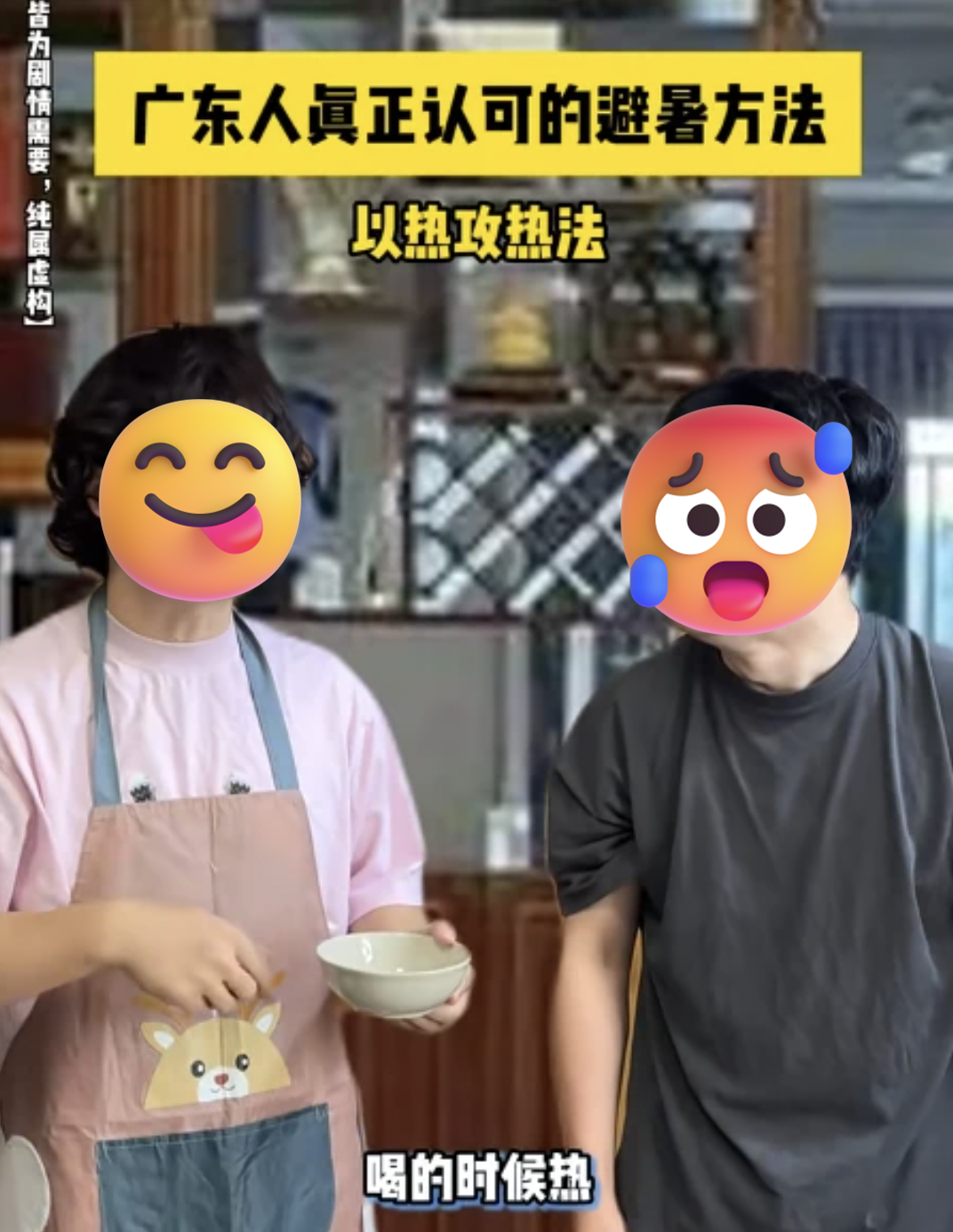比如面对40度高温也要喝一碗热得冒烟的靓汤,所谓以热攻热;还有睡觉时把阿贝贝换成巨型冬瓜,“真正的水枕,用过的都说好”。