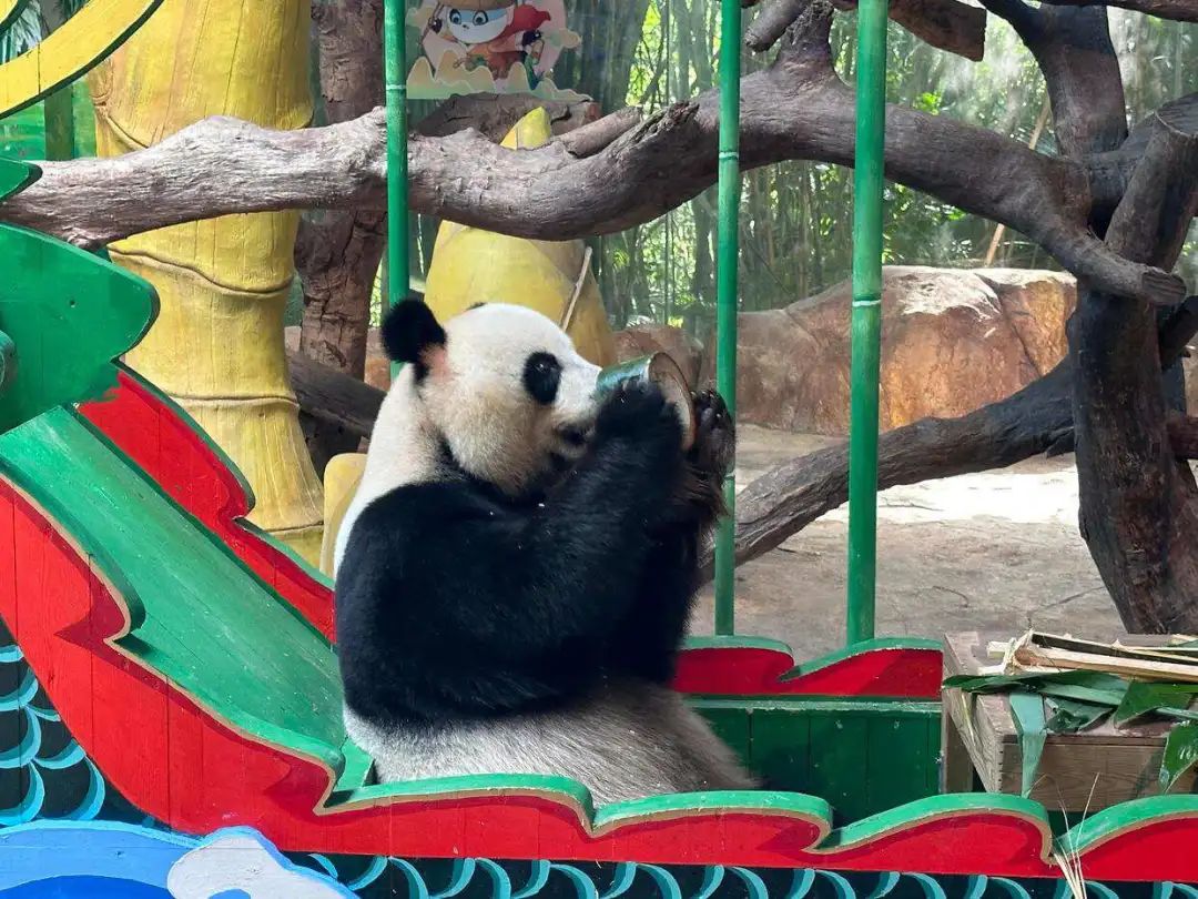 顶着高温欣赏大熊猫三胞胎的打工人却在围栏前愣住了,怎么你们老广动物的消暑汤都得是凉茶?