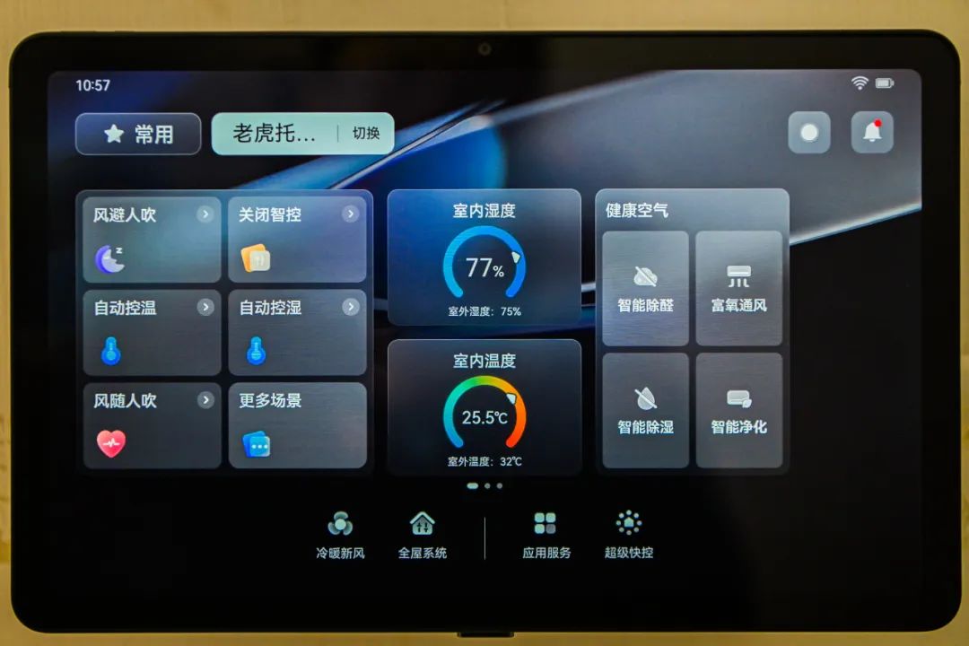 这是一款自主性很强的老管家。华为鸿蒙智家说咱家的老管家主打“会思考”“能懂熊”,通过控制系统在房间里联动上空调、冷暖新风系统、智能开窗器、除湿机、空气净化器和空气传感器等设备,并设置成大熊猫三胞胎喜欢的温度和湿度,之后就会根据预设值进行自动优化、自我管理。